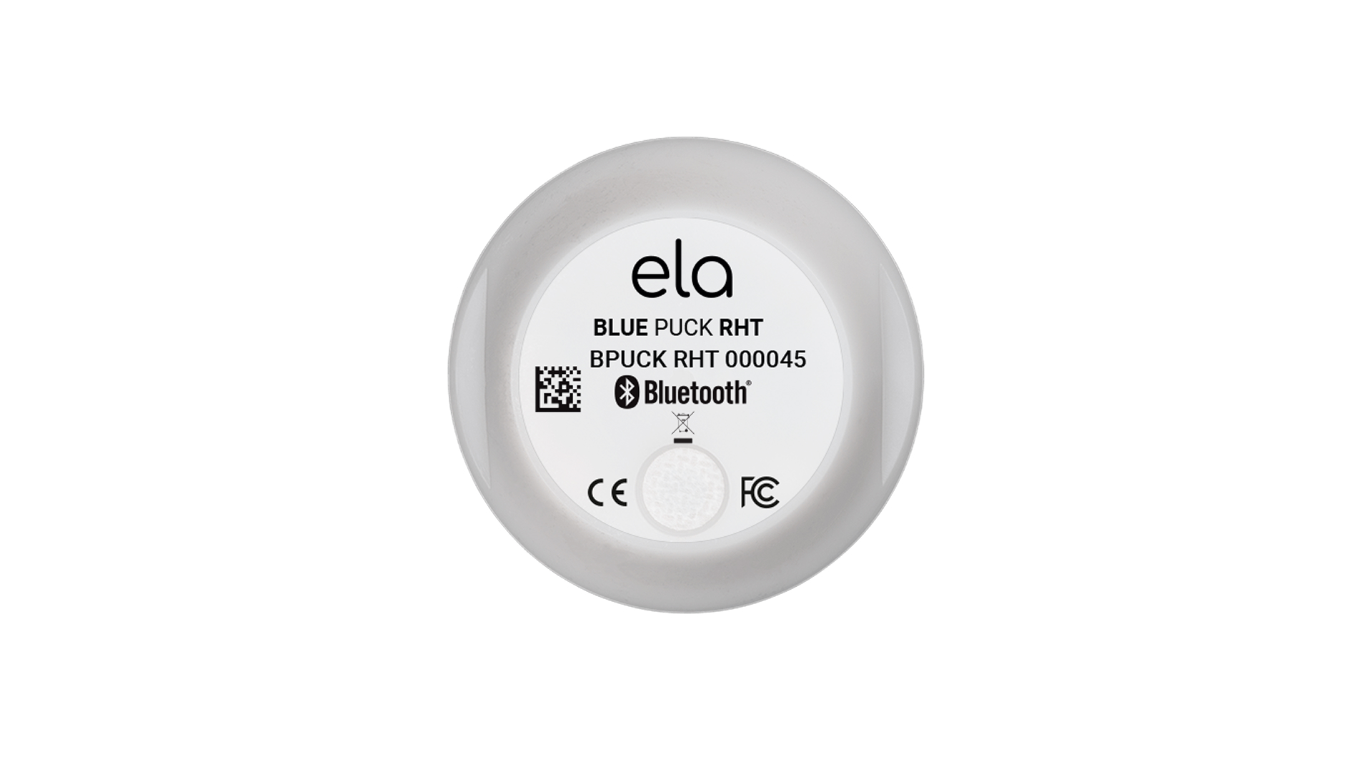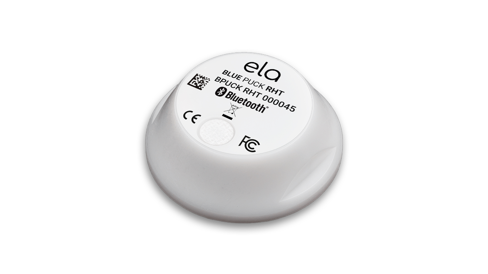 El Sensor inalámbrico de temperatura y humedad utiliza el ELA Innovation Blue PUCK RHT, un sensor Bluetooth compacto y resistente para monitoreo ambiental preciso.